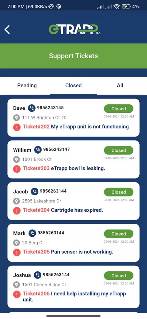 Installation technicians will download the eTrapp Pro app from the Apple App Store or Google Play Store. This specialized app shows the live data captured from all of the eTrapps they have installed at client homes and businesses. Units in alert status display in the Support Tickets section for easy service scheduling.